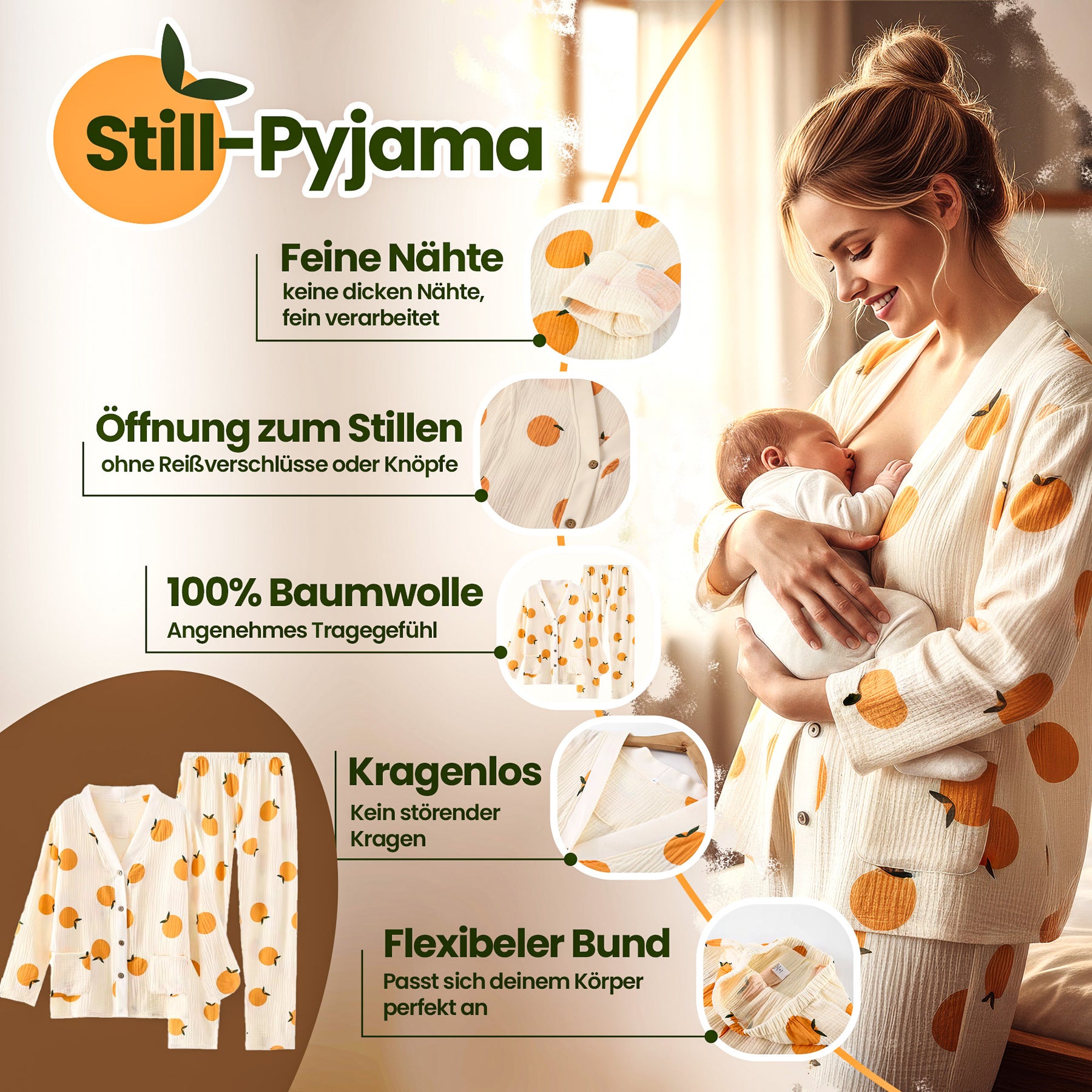 Unser Pyjama mit dem charmanten Orangen-Motiv ist aus 100% reiner, gewebter Baumwolle gefertigt. Das macht ihn nicht nur wunderbar atmungsaktiv und federweich, sondern auch besonders hautfreundlich – ideal für sensible Haut in der Stillzeit. Fühl dich rundum wohl und genieße den sanften Stoff, der dich nicht nur wärmt, sondern auch ein angenehmes Körperklima schafft.